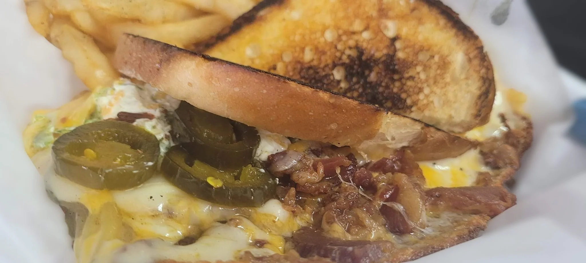 The incredible 5 cheese blend, warm cream cheese, sliced jalapenos melted together with crispy bacon on grilled sourdough